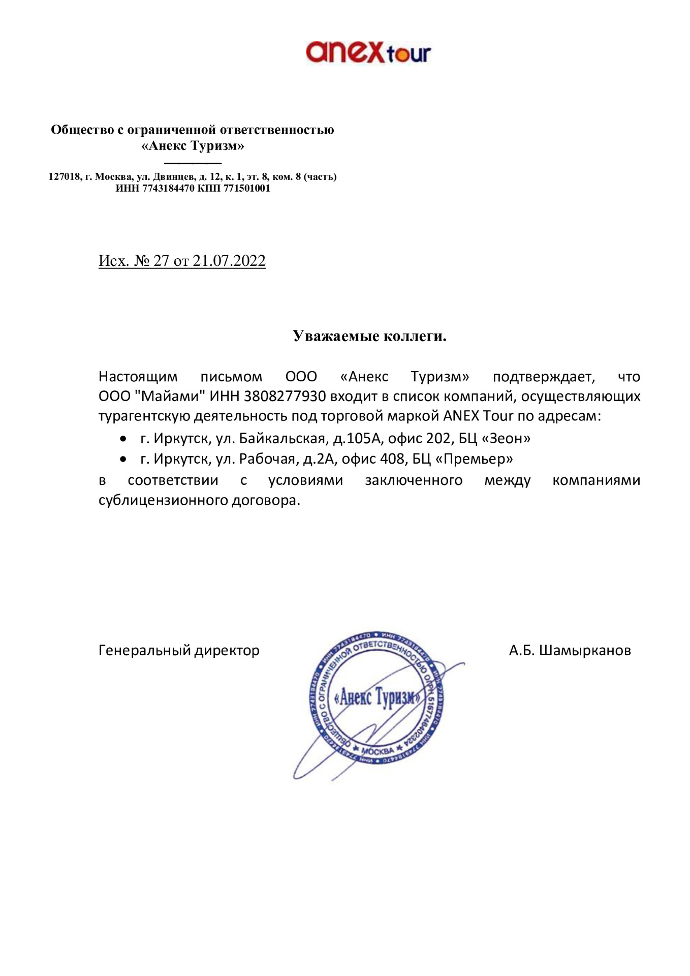 ООО "Майами" ИНН 3808277930 входит в список компаний, осуществляющих турагентскую деятельность под торговой маркой ANEX Tour